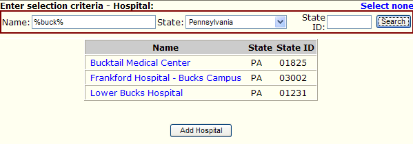Click on the magnifying glass. If there is no drop down menu, click on whatever icon you get and you will be presented with a search. Enter some part of the name in the format %name%, enter the state, select the hospital by clicking on its full name.