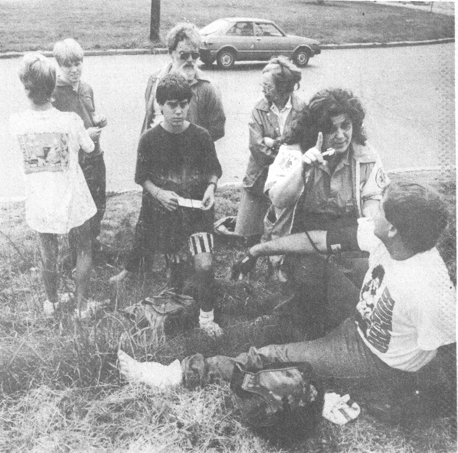 1986 multiple motorcycle MVA on Pennington Circle, kneeling with patient, Carol Davis, in back (left to right) Richard Bailey Jr, Richard Bailey, Jessie Bailey