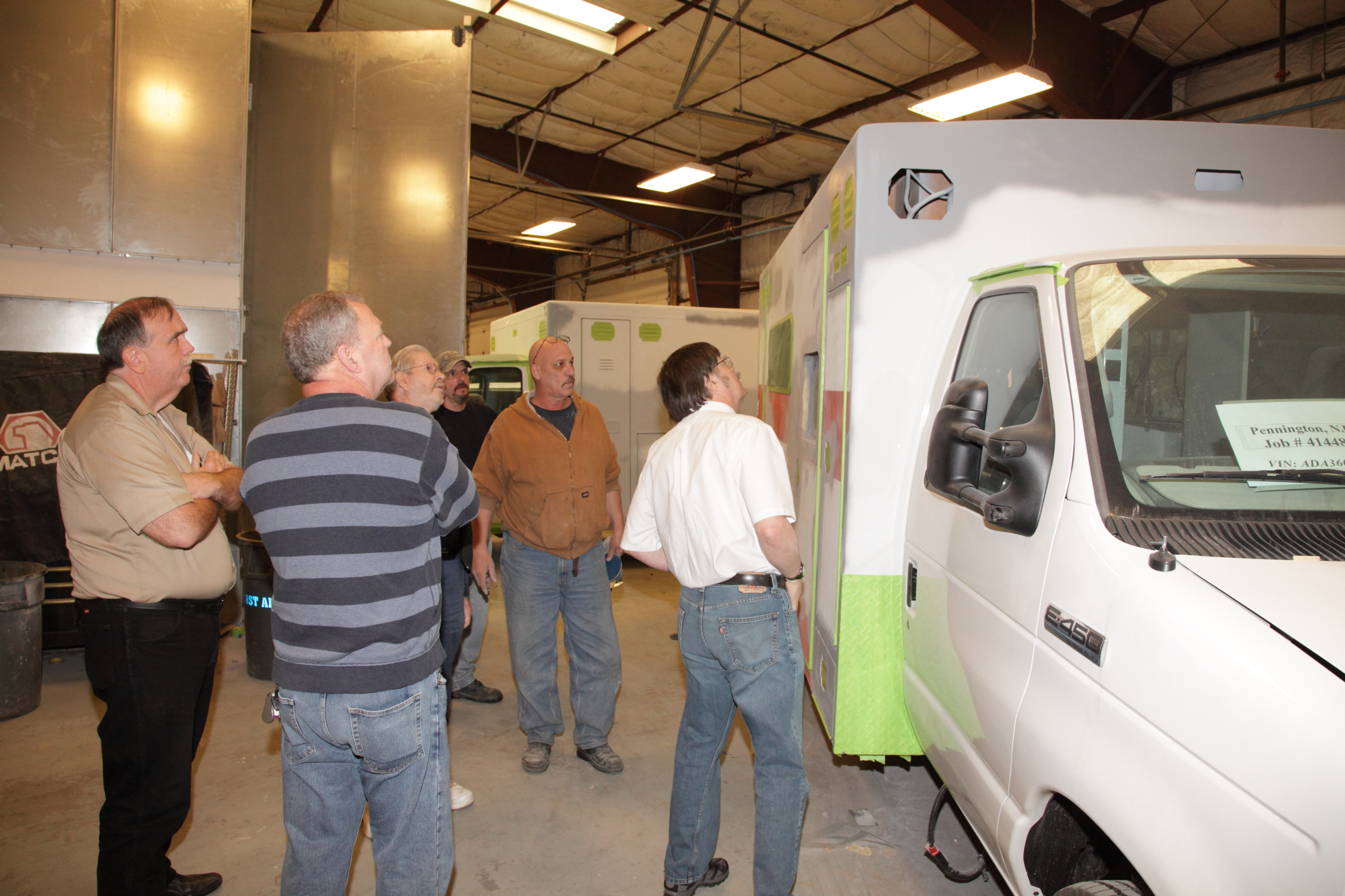 Inspecting repair to upper corner of box damaged in fight with tree, Bob Freeman (President First Priority), Tom Tedd, Zay Risinger, First Priority crew, Kirk Schmitt