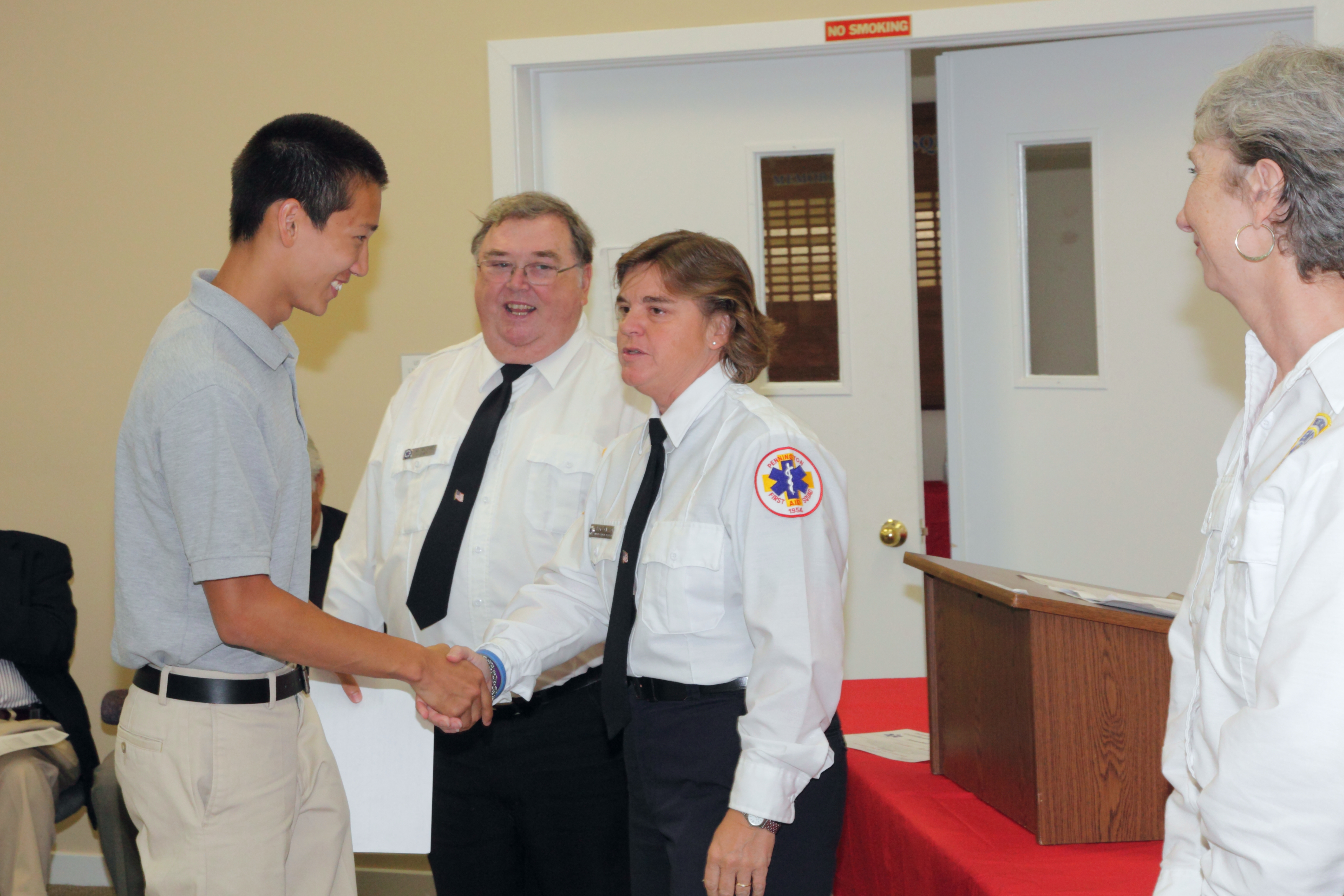 Summer EMT graduate Edward Zeng receives certificate from Dan Boone, Cindy Orlandi, and Julie Aberger
