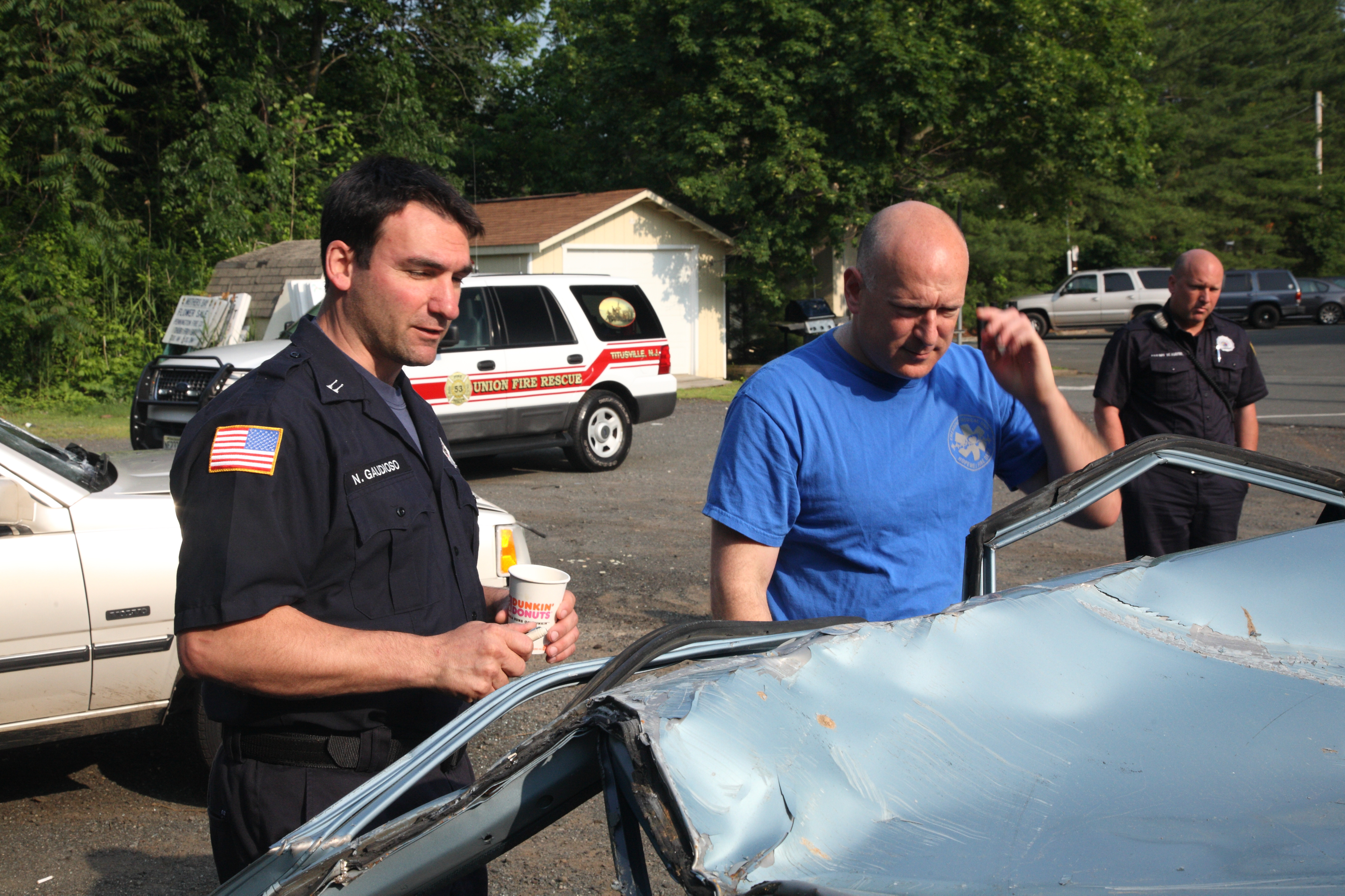 Pennington Fire Company Captain Nick Gaudioso and xxx discuss the operation in the staging area behind Pennington Fire.