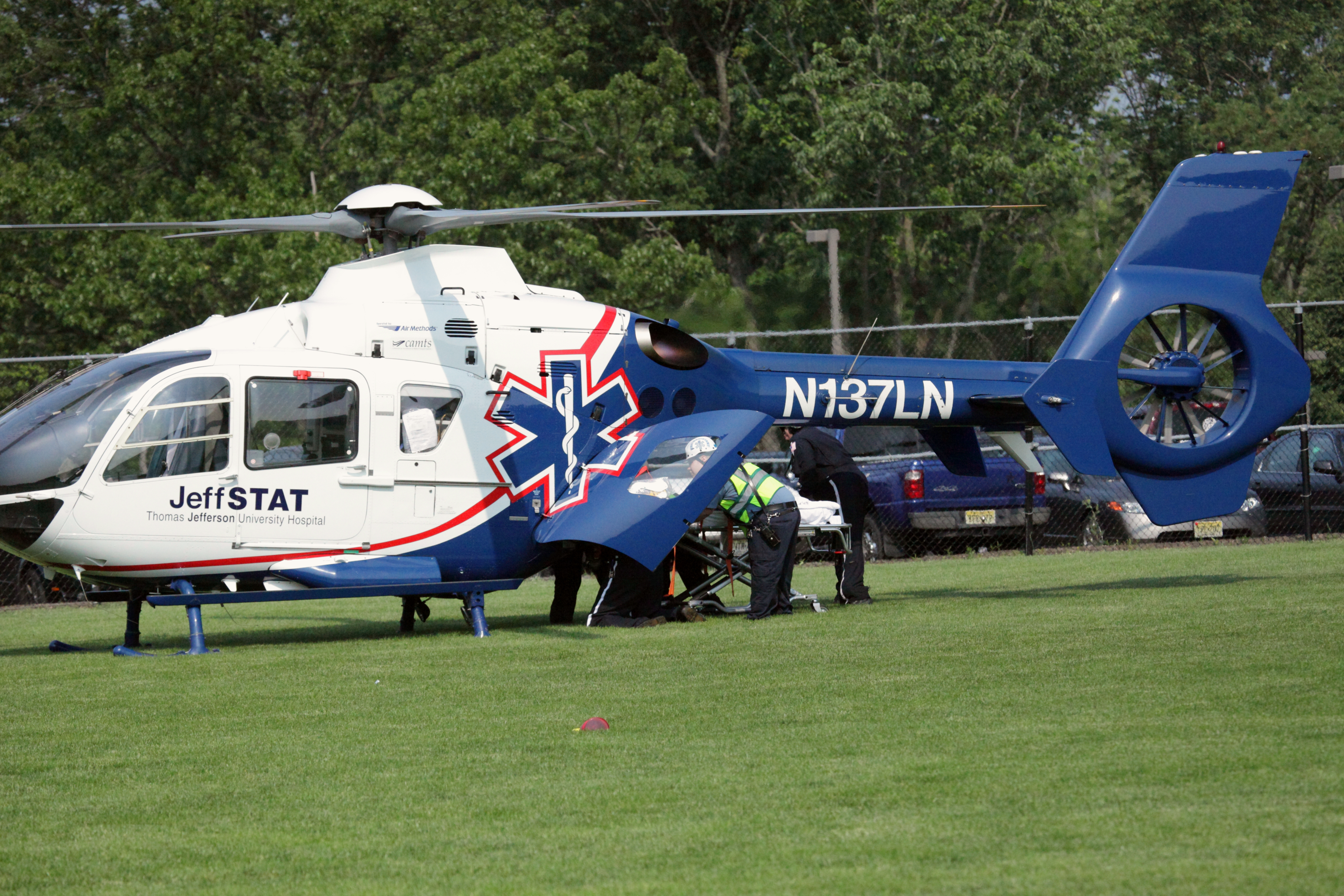 Second critical patient, played by Melissa Helmstetterr is loaded into JeffSTAT helicopter from Thomas Jefferson University Hospital. PFAS Assistant Captain John Muccioli can be seen through the door window.