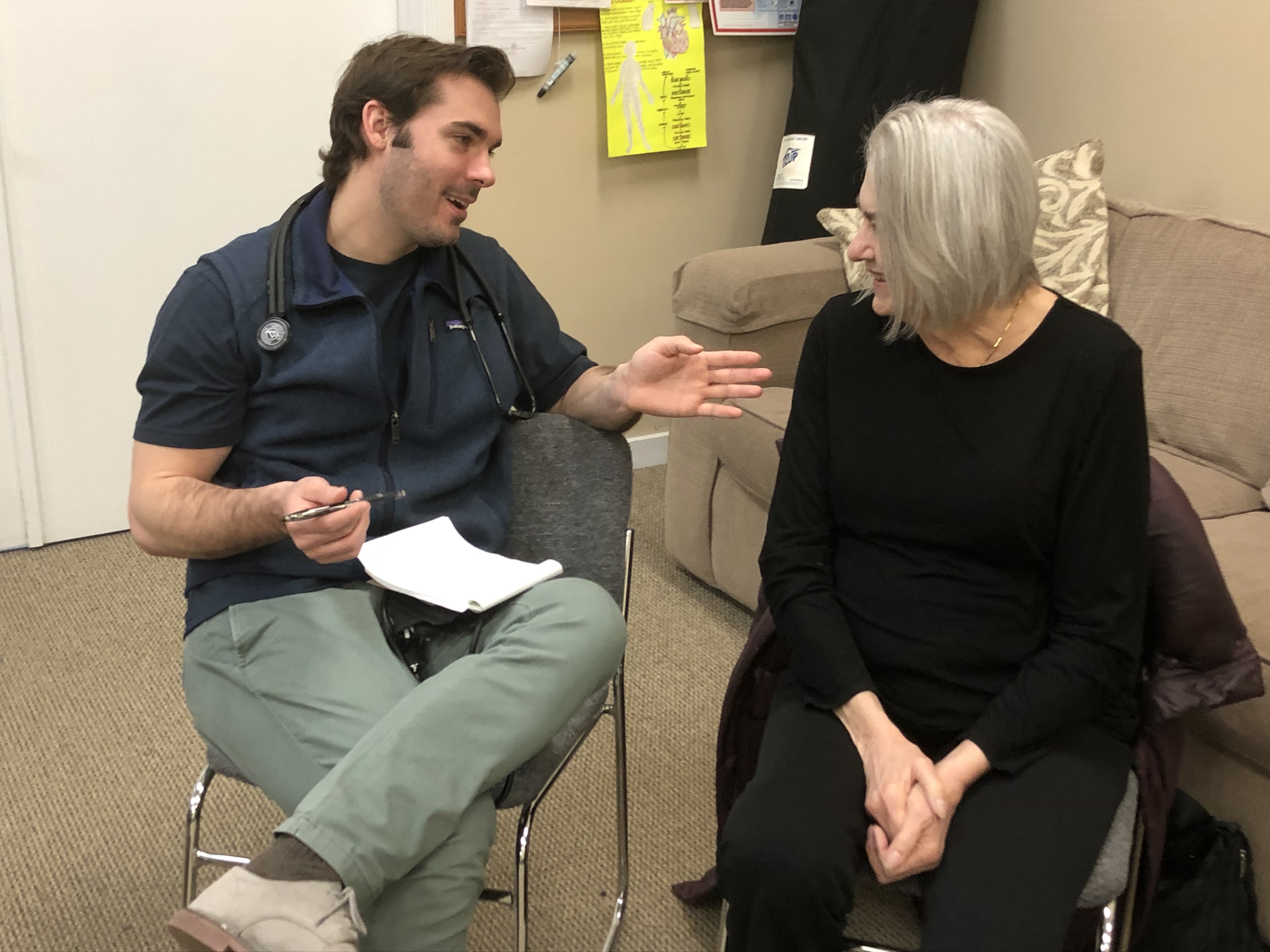 Assessing the Geriatric Patient: EMT student Chris Womack quips with the older patient while obtaining information about her recent health, making her feel at ease with his questions.