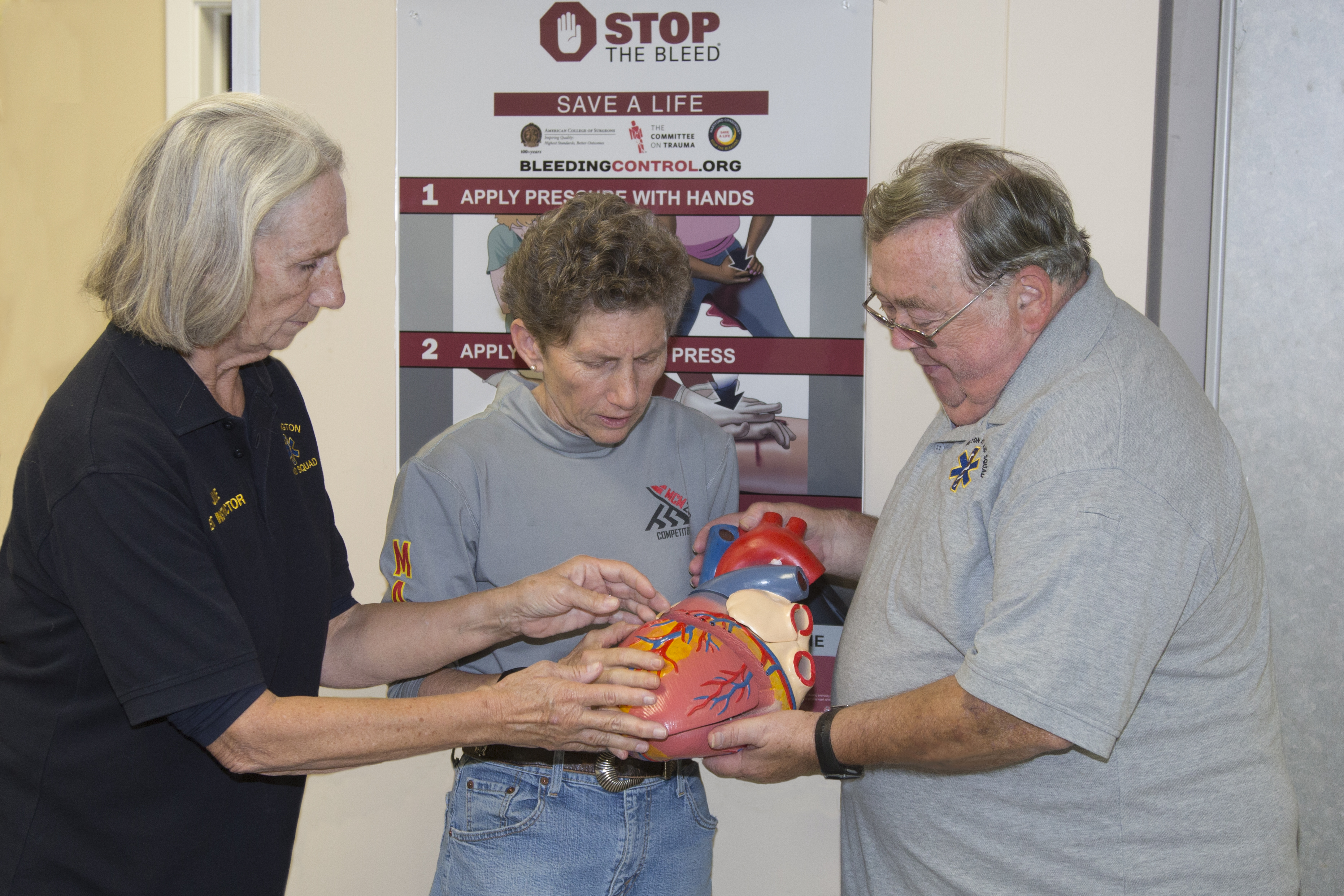 EMT instructor Julie Aberger, EMT student (now EMT) Shelley Pennington, and EMT instructor Daniel Boone examine a large scale model of the heart. Aberger and Boone have been teaching the EMT class at Pennington for 15 years. Shelley Pennington rode for 3 months on EMS calls in the PFAS observer program before taking the course.