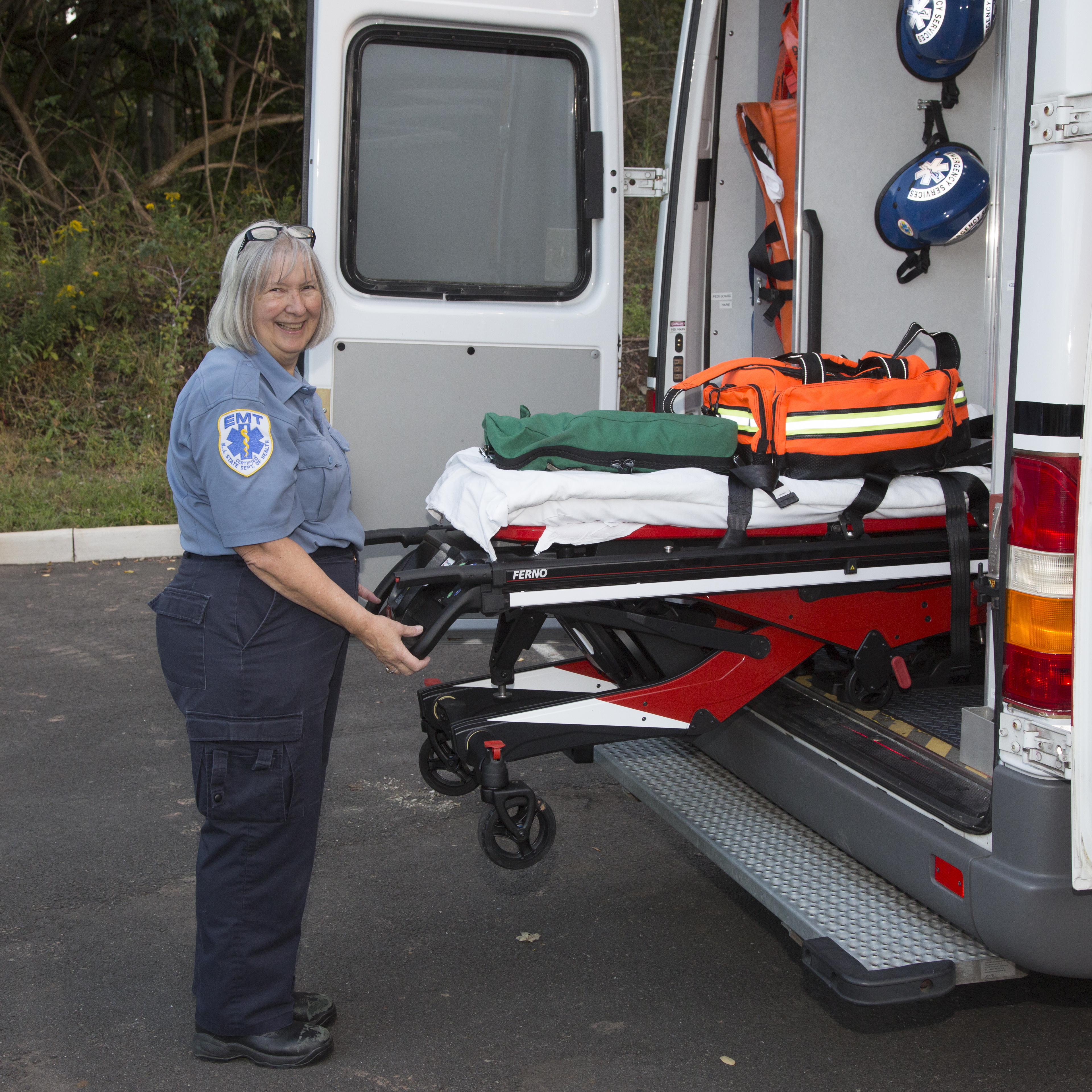 Naomi McCarty unloading new power-lift stretcher and equipment from Pennington ambulance 151-2. One person can lift and load up to 700 lb at the push of a button.