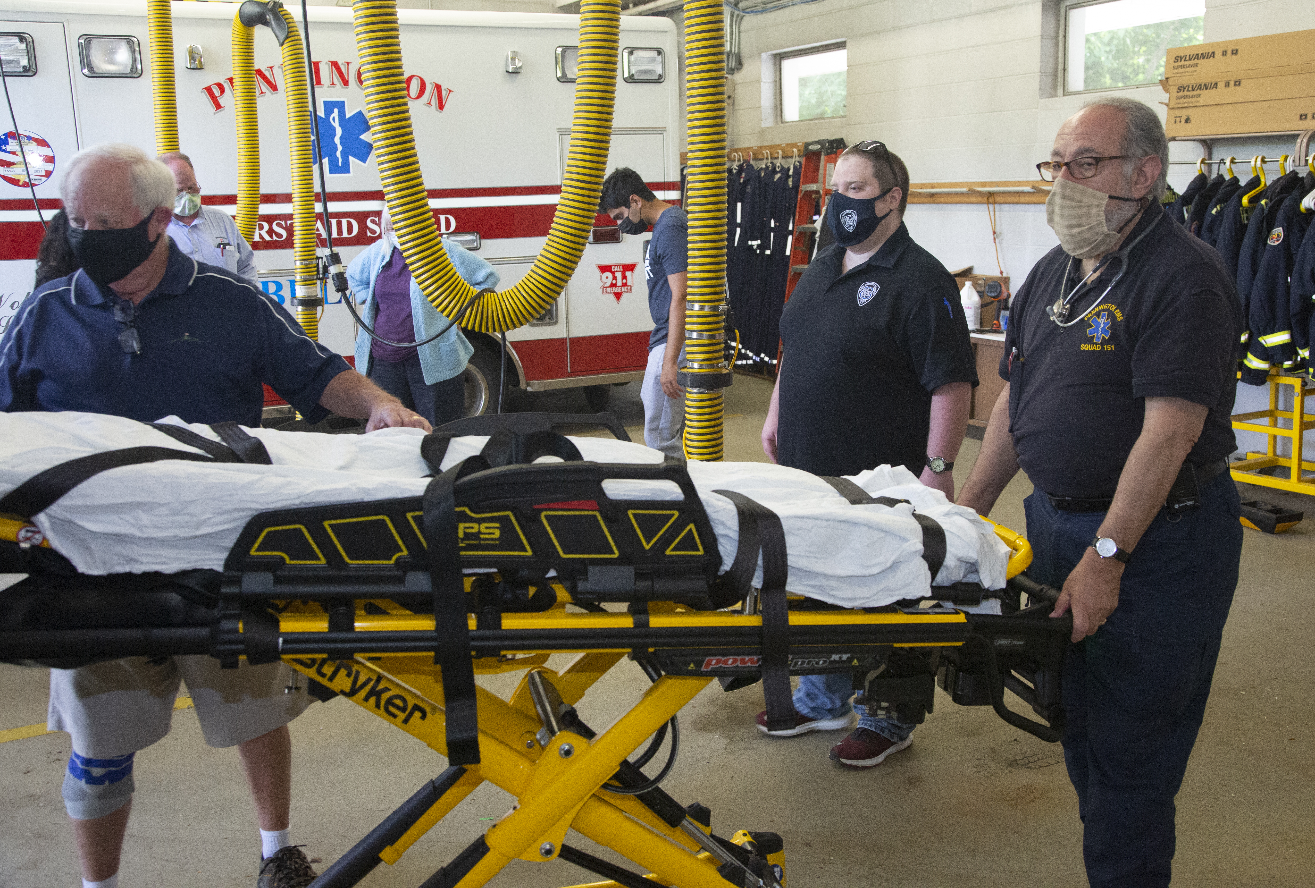 Members Richard Gordon (left) and Arthur Bogad (right) practice with Stryker Power-Pro while Captain John Muccioli (back) looks on.