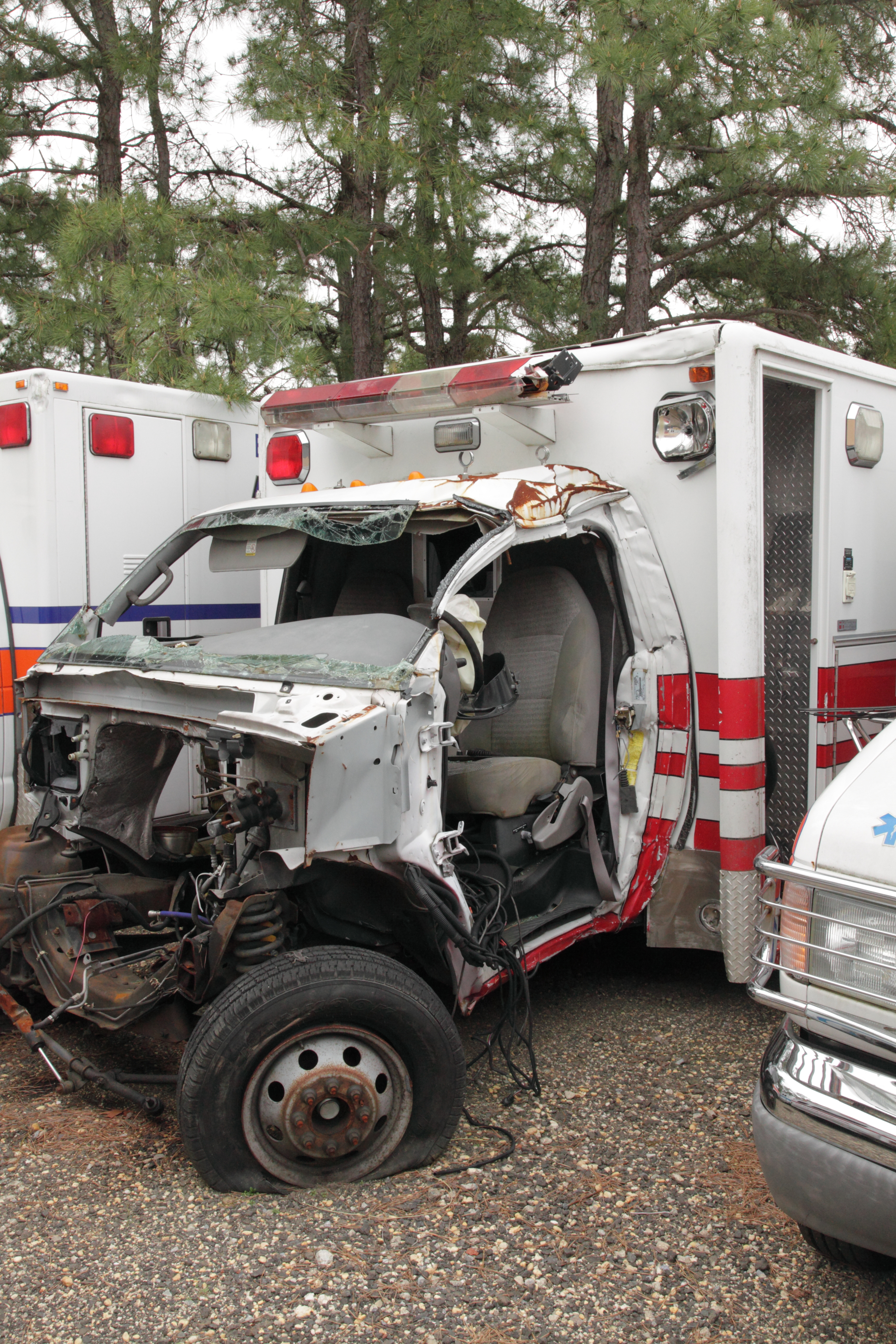 First Priority boneyard --- Ambulance versus telephone pole, driver had to be cut out