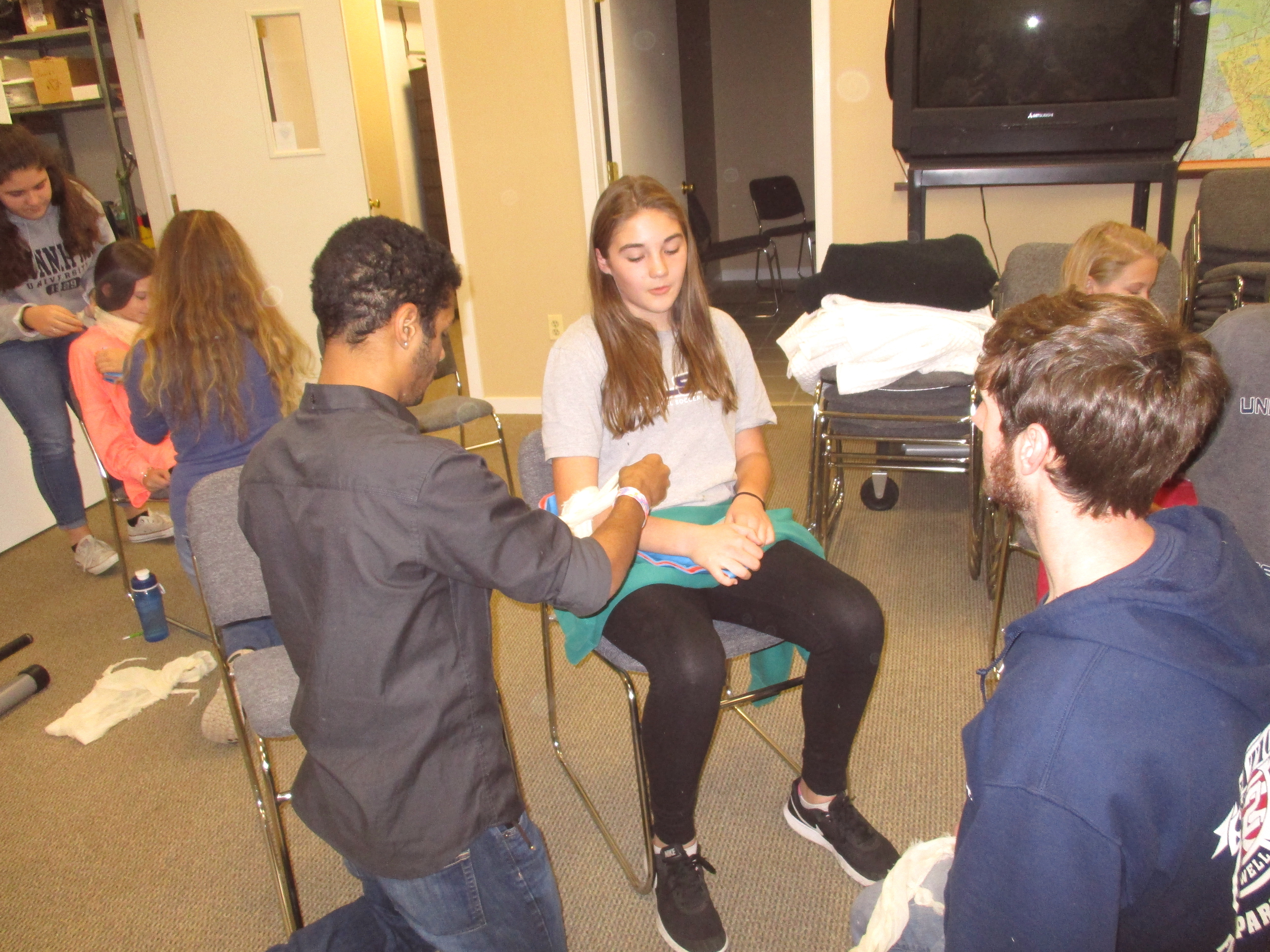 EMT student Ian Green practices placing a dressing on a pediatric student while EMT student Kyle Devlin watches