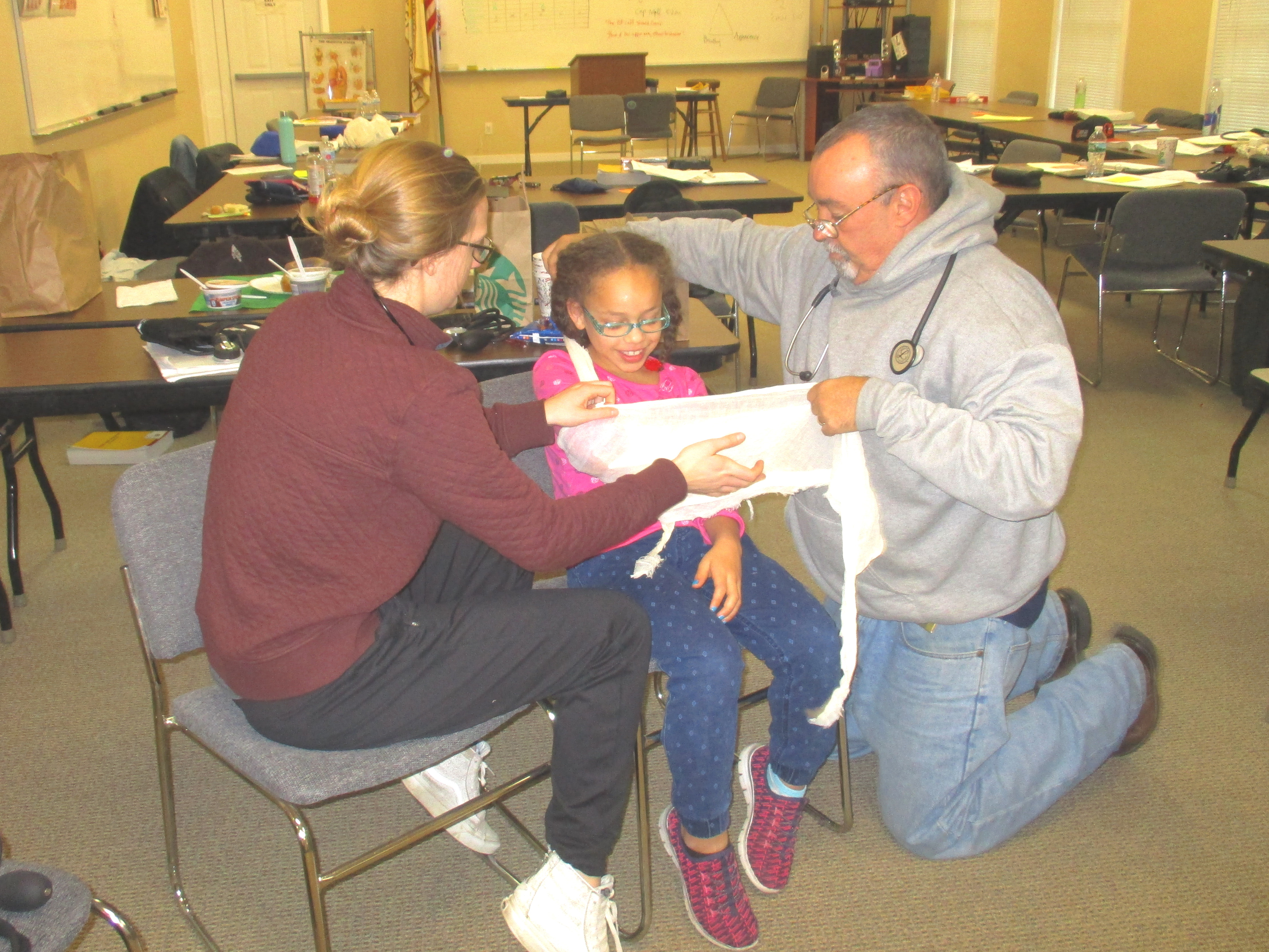 EMT students Lindsay Becker and Michael Manning, Sr. practice placing a sling and swath on a pediatric student