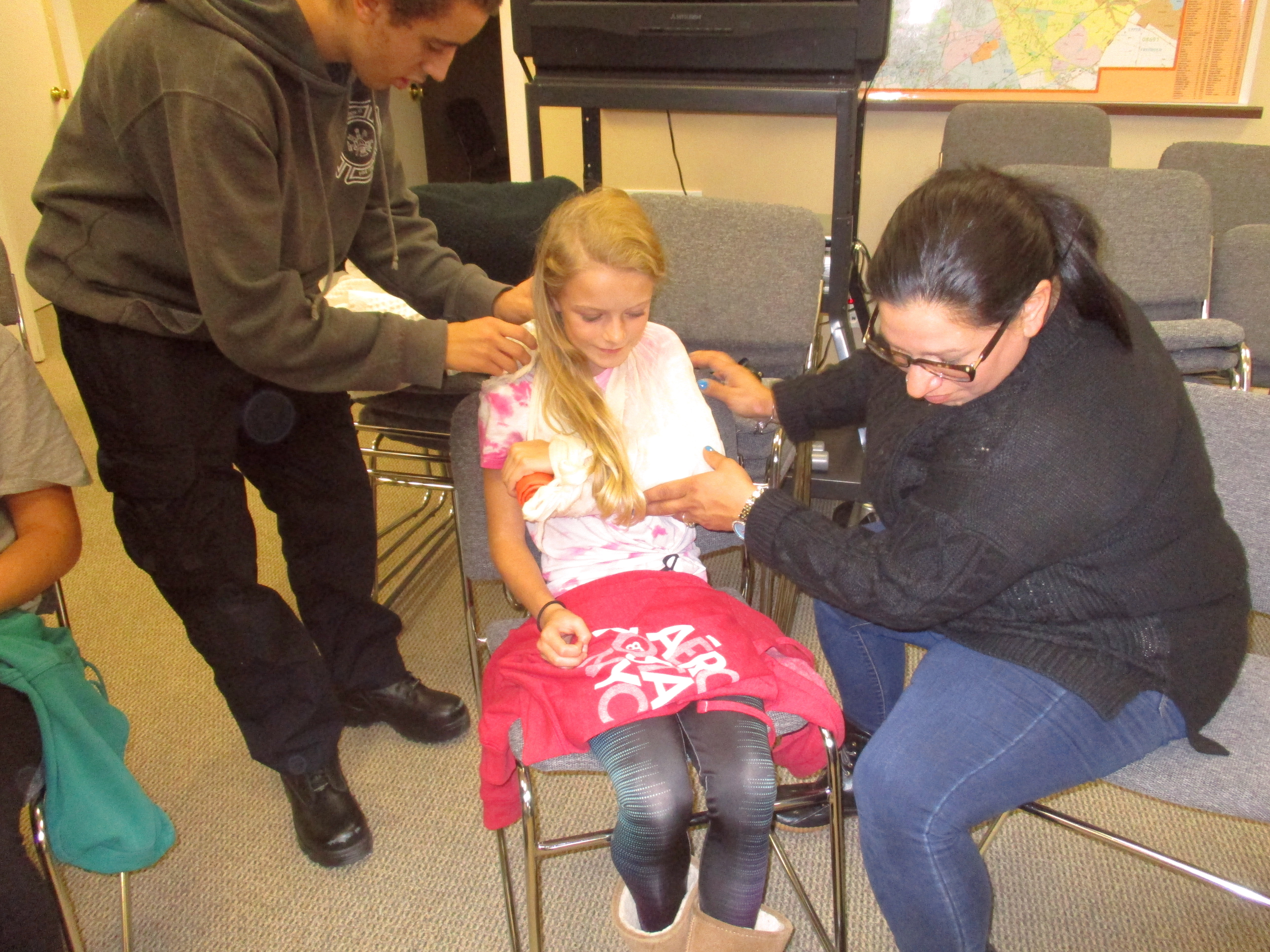 EMT students Michael Manning, Jr. and Serena Celleri-Hall practice placing a sling and swath on a pediatric student