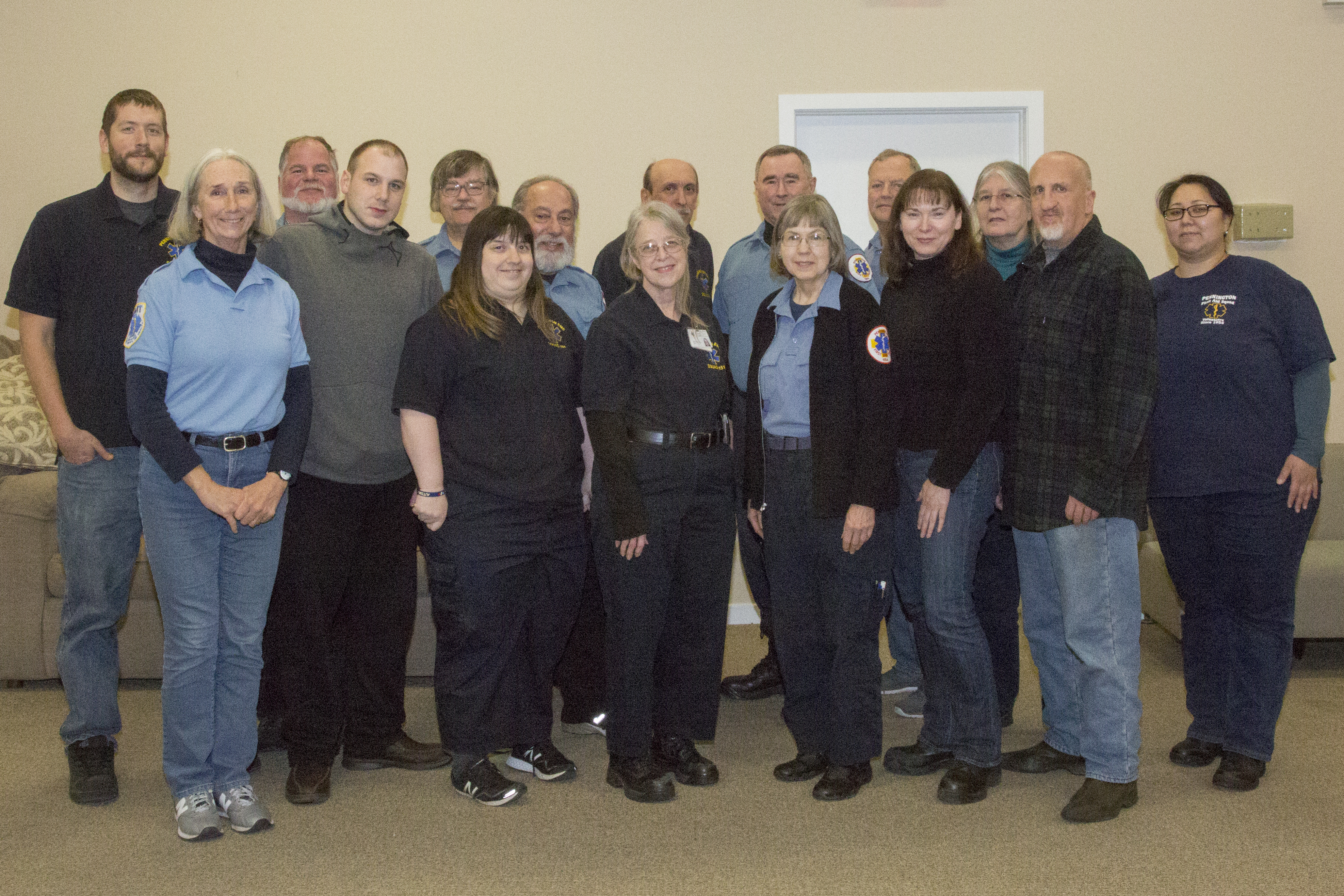 2017-1-10 Group photo at Squad meeting. Left to right: Ben Tredrea, Julie Aberger, Neal Blackwell, Jack Ferrara, Kirk Schmitt, Heather Varrasse, Art Bogad, June Guerard, Ed Grobelny, Doug Kabay, Joan Schwarzwalder, Tom Tedd, Sarah Hopkins, Bonnie Schmitt, Jeff Alpert, Nagima Alymkulova
